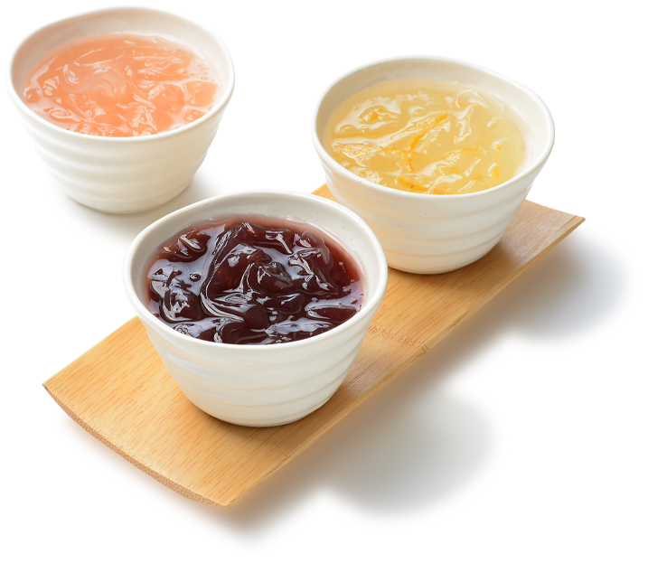 果汁たっぷりのやわらかなジュレに葛きりを合わせた、ぶどうの森オリジナルデザート。 果実の芳酵さと葛きりの歯触りのよさをお楽しみください。